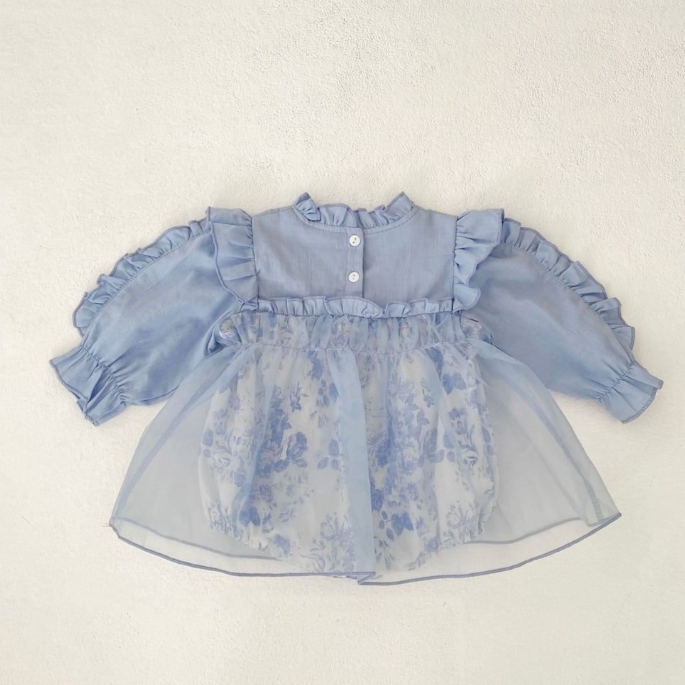 お子様の可愛らしさを引き立てる、ブルーフラワーデザインのチュールロンパースです!柔らかく軽やかな素材感で、春夏のお出かけや特別なイベントにぴったりです。