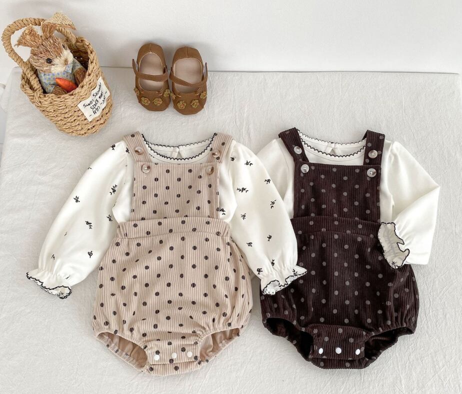 やわらかなコーデュロイ素材に、可愛らしいドットデザインが映えるサロペットロンパース。おしゃれでありながら動きやすく、お子様の日常や特別なシーンにぴったりのアイテムです。