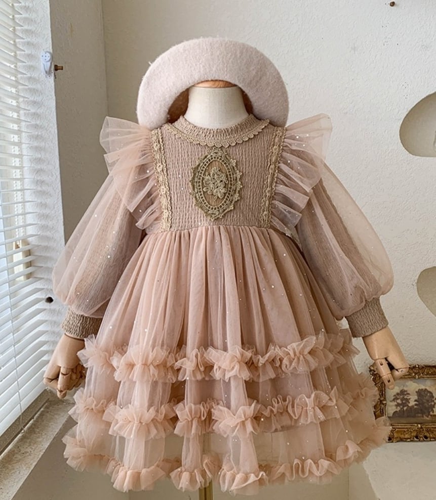 エレガントなアンティークレースを使用したシフォンドレスは、お子様の可愛らしさを引き立てる特別なアイテムです♡ パーティーやお出かけ、撮影にぴったりで、ふんわりとしたシルエットが魅力を引き立てます♪