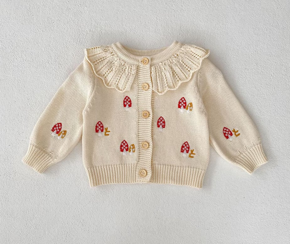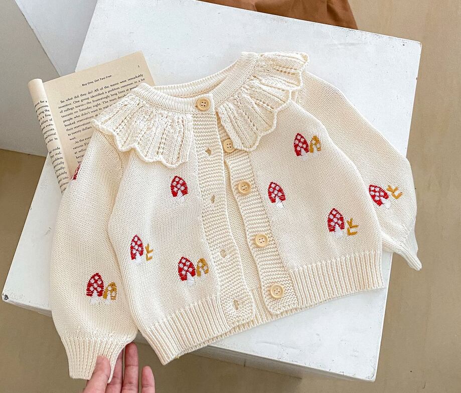お子様のおしゃれが楽しめる一着です。優しい肌触りのニット素材で、着心地も抜群。可愛らしいきのこのデザインは、どんなシーンでも注目を集めること間違いなしです♡