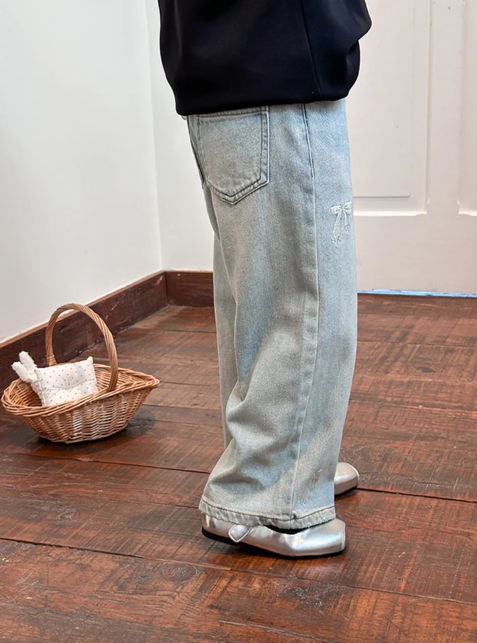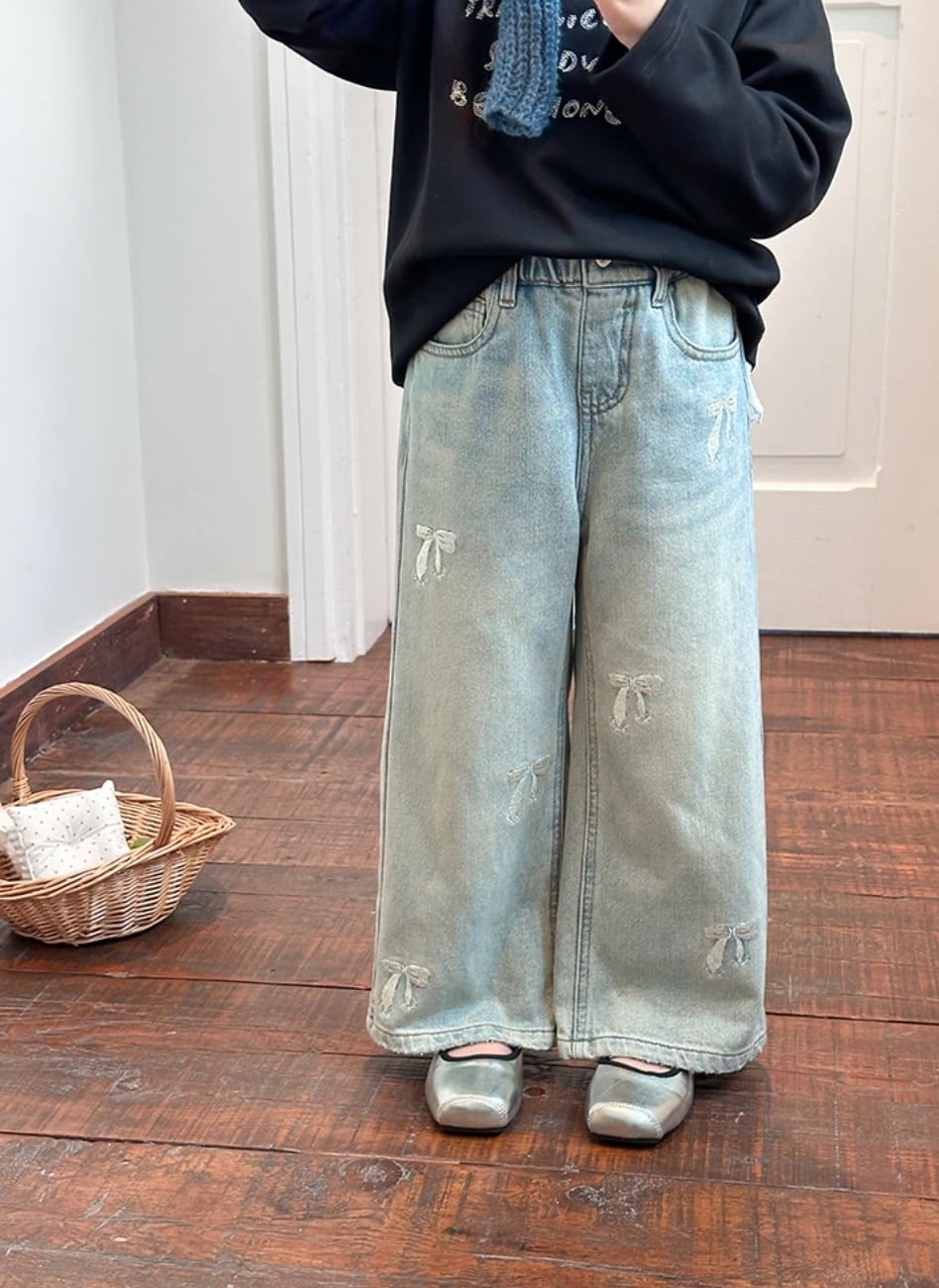 【予約】【90-150 】リボン 刺繍 付き ワイドパンツ pp