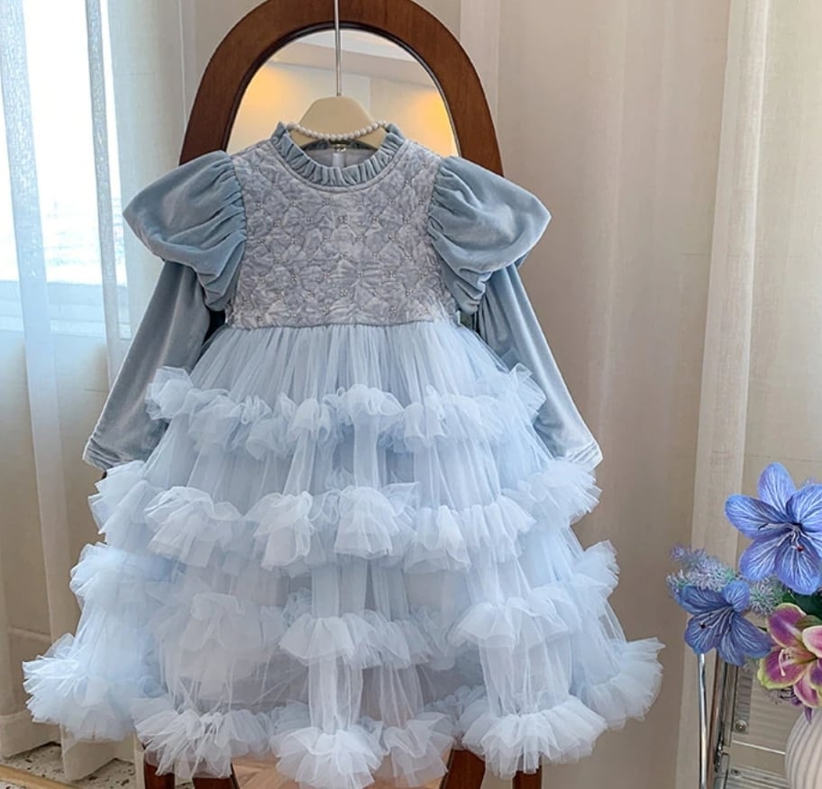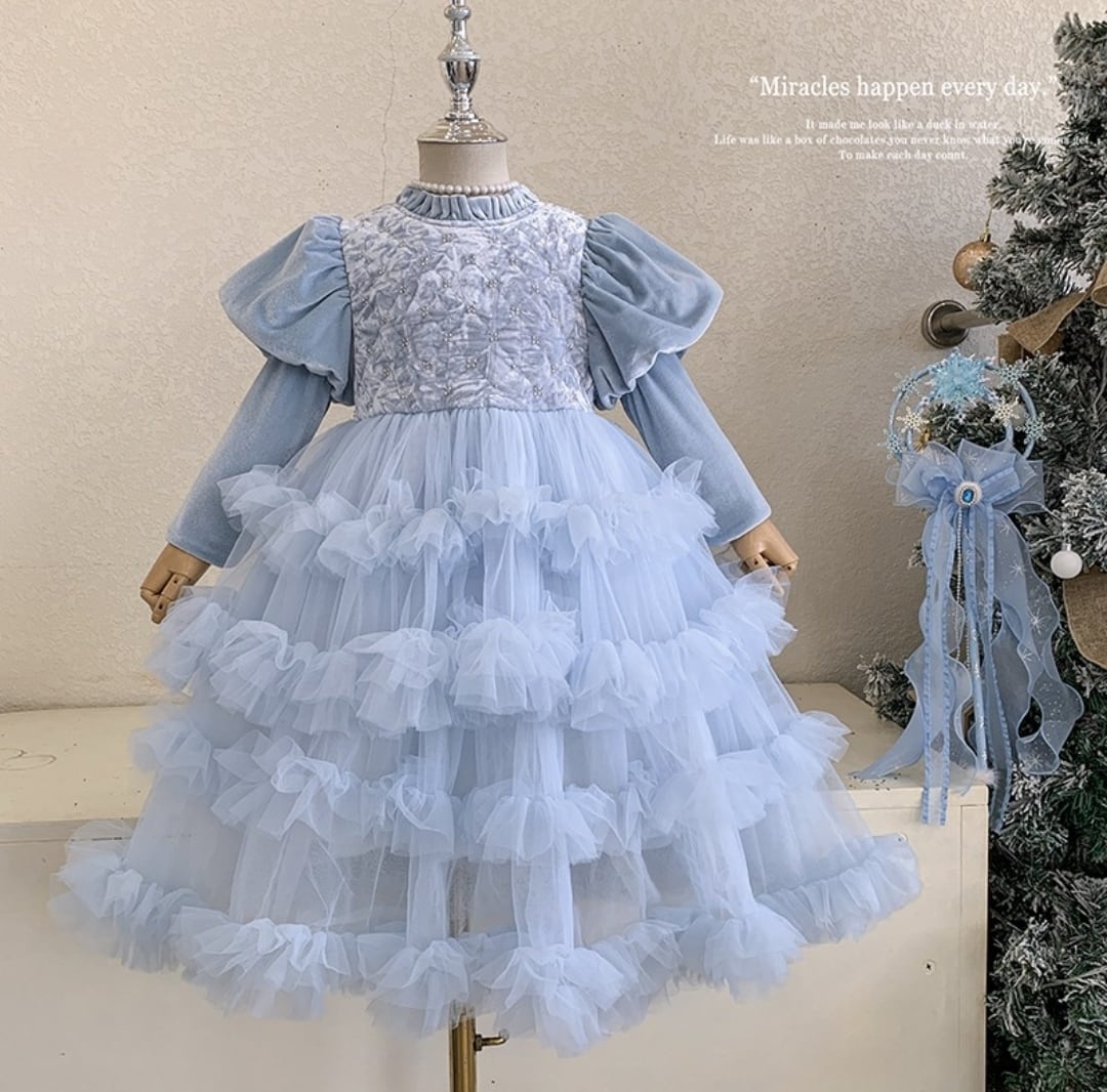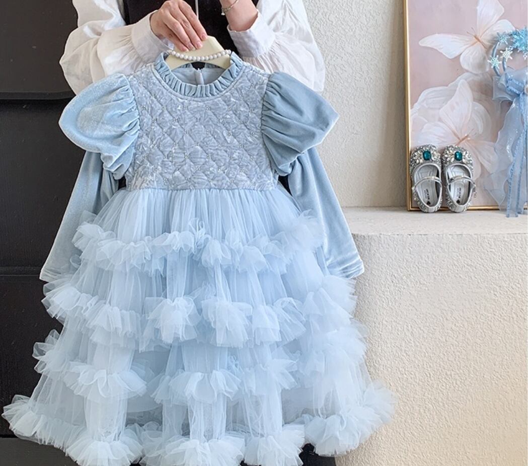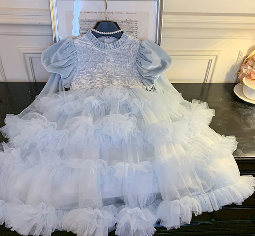 柔らかいベロアの質感とふんわりしたティアードデザインが、お子様をキュートなプリンセスに変身させます!高級感のある大人っぽい雰囲気で、思い出に残る瞬間を演出します♡