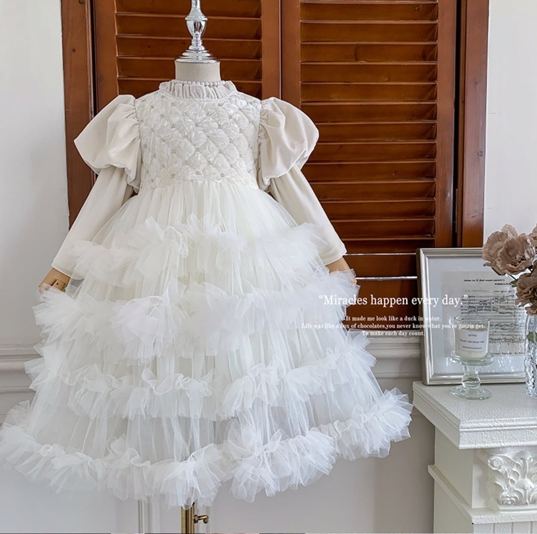 柔らかいベロアの質感とふんわりしたティアードデザインが、お子様をキュートなプリンセスに変身させます!高級感のある大人っぽい雰囲気で、思い出に残る瞬間を演出します♡