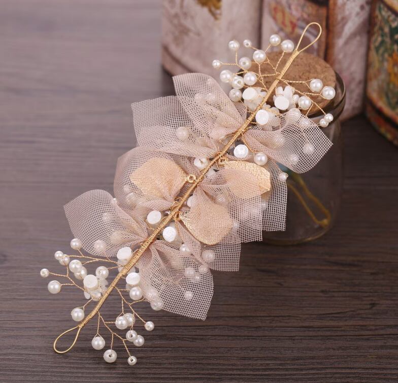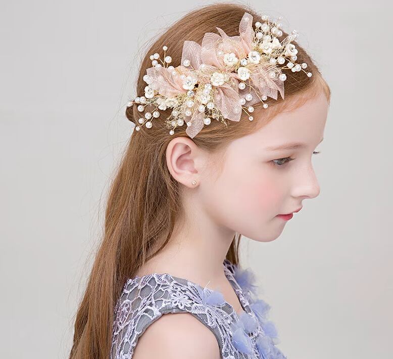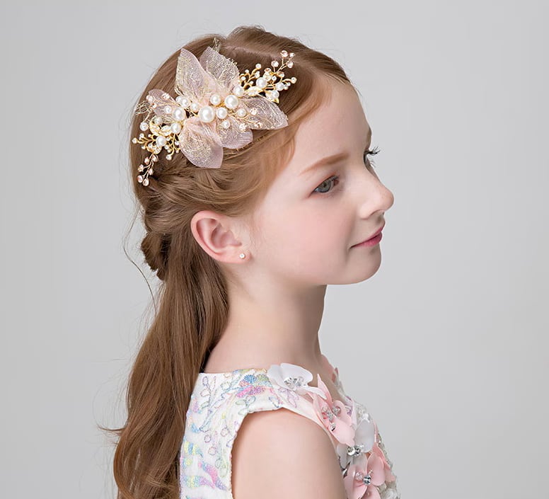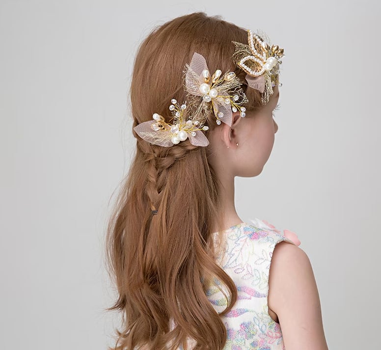 パールとフラワーデザインのヘアアクセが可愛らしさを引き立てるアイテム。