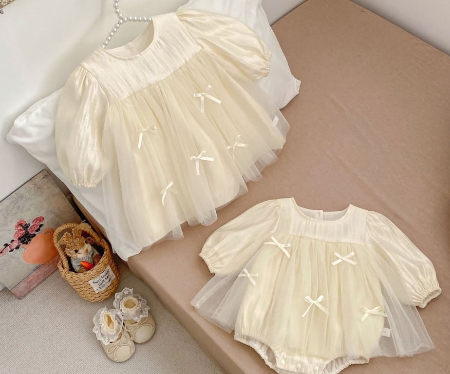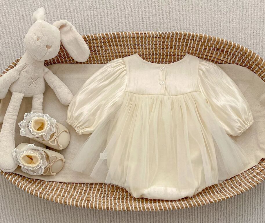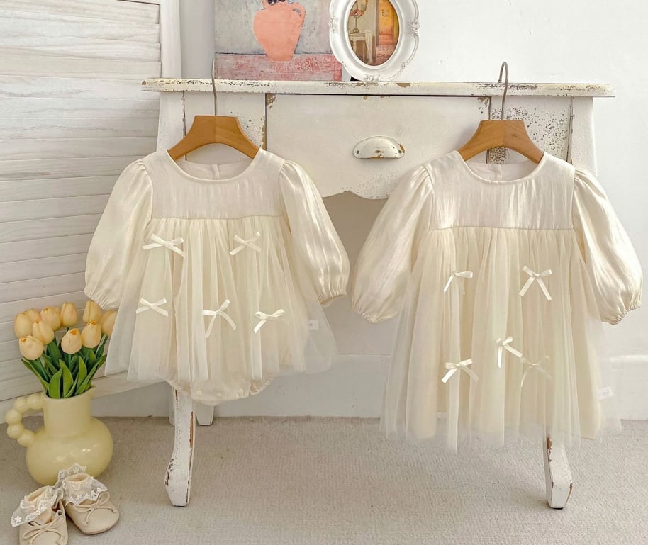 リンクコーデにぴったり♡ 華やかなリボンとプリンセスのようなチュチュレースが魅力的なロンパースです♡ お子様を特別な存在にしてくれる一着で、誕生日パーティーや発表会、おしゃれなお出かけに最適です。♡
