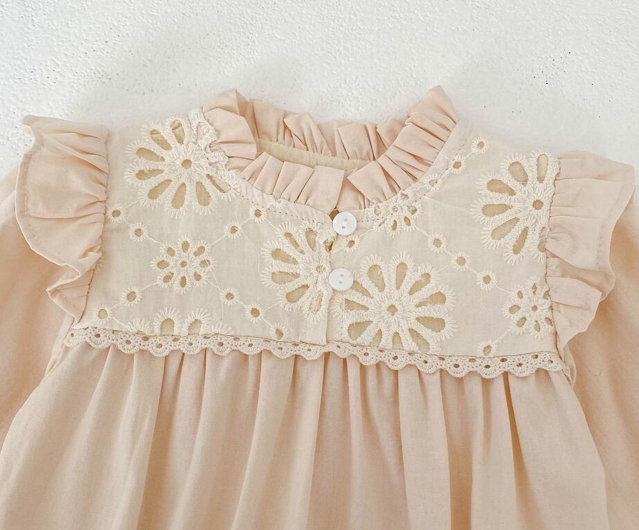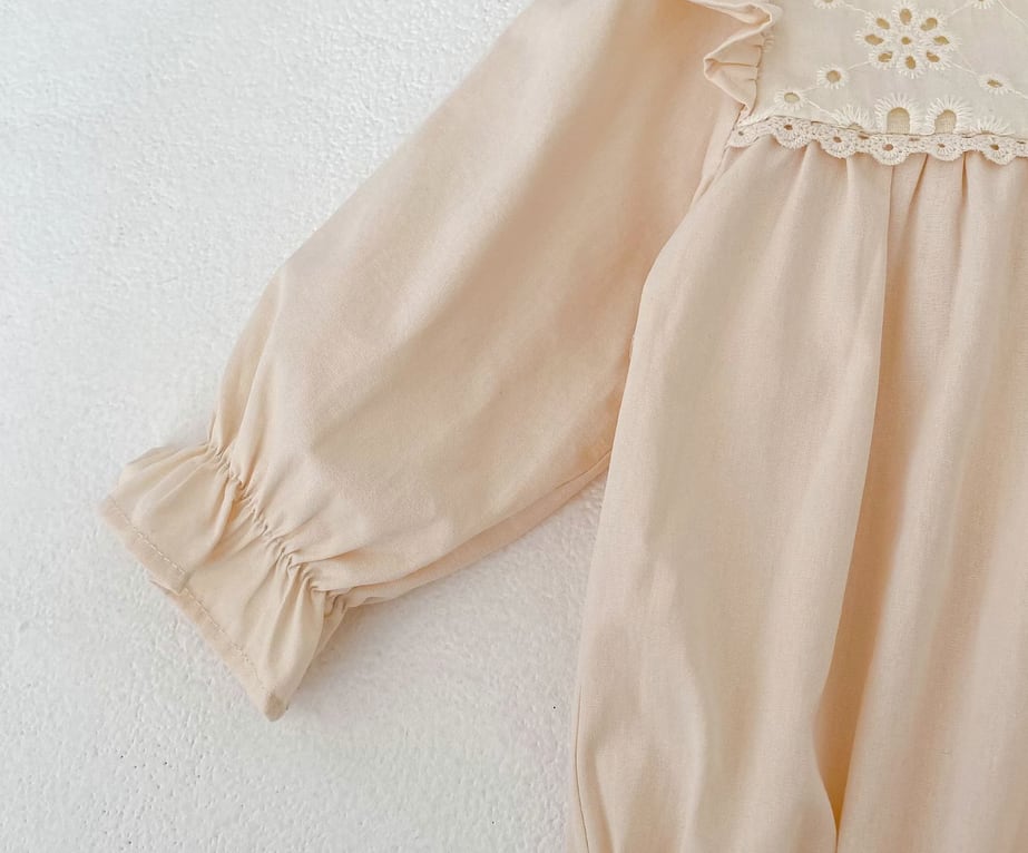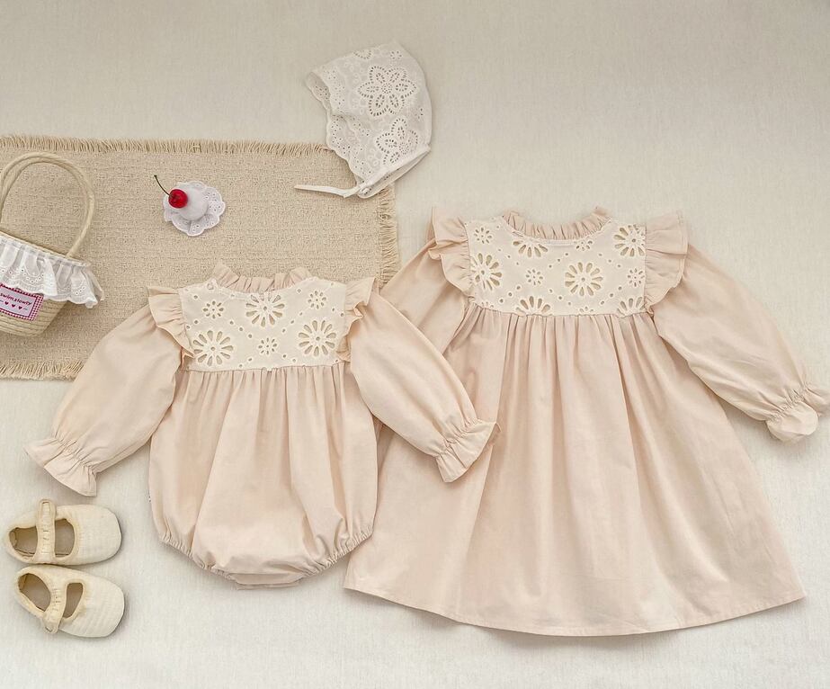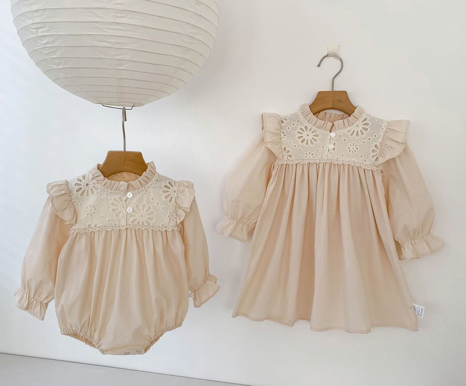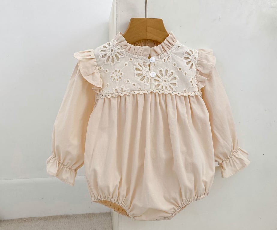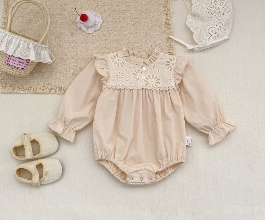 リンクコーデにぴったりな、一枚でおしゃれを楽しめるナチュラルレースのロンパース。