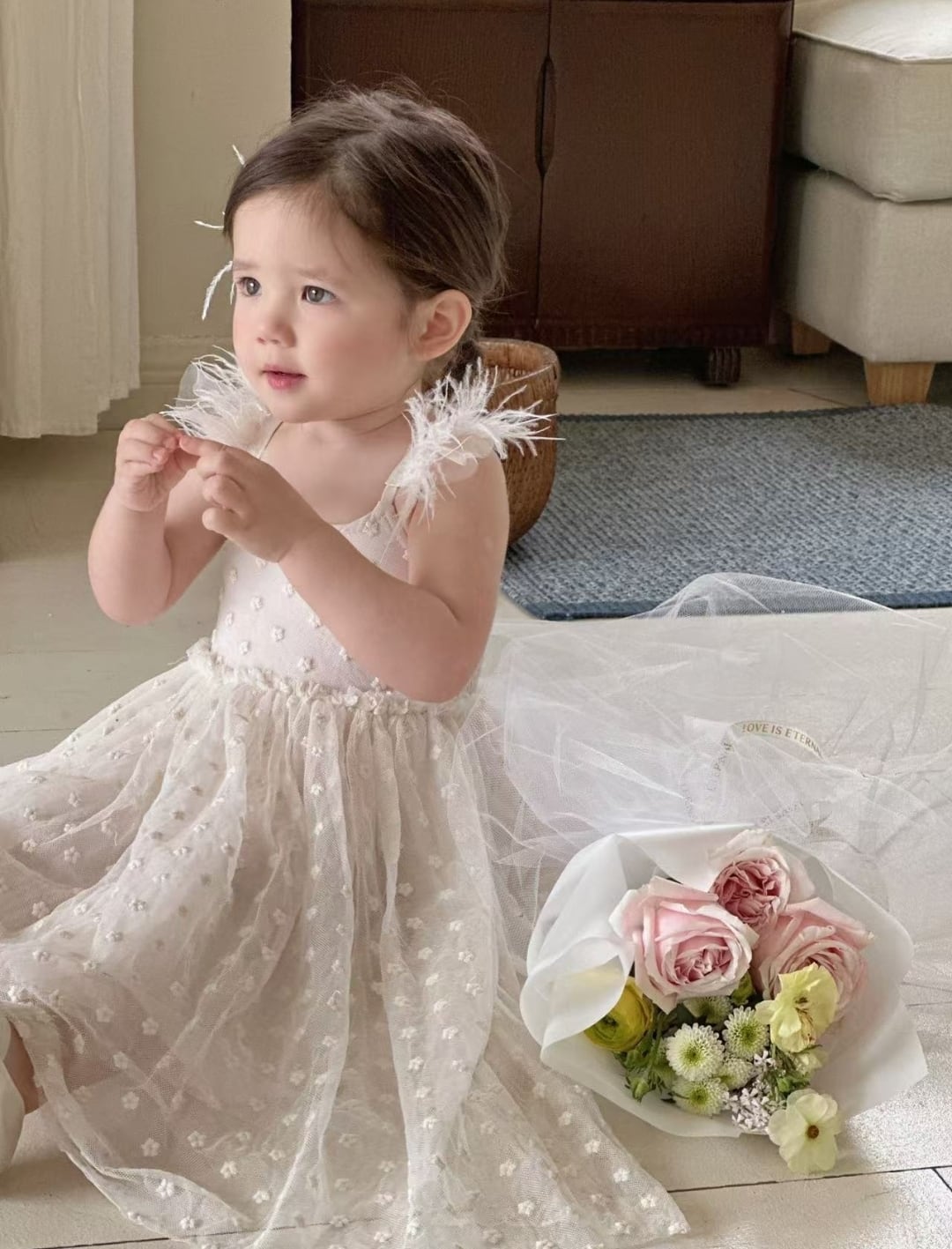 華やかなフェアリーウイングデザインのロングチュールドレスで、お子様を特別なプリンセスに変身させます♡ 軽やかなチュール素材と流れるようなラインが、どんなシーンでも可愛らしい印象を与えます♡