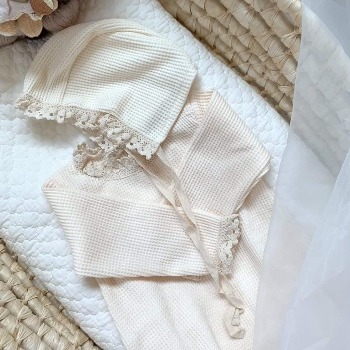 フリルが可愛い ワッフル 素材 ボンネット & ロンパース です♡