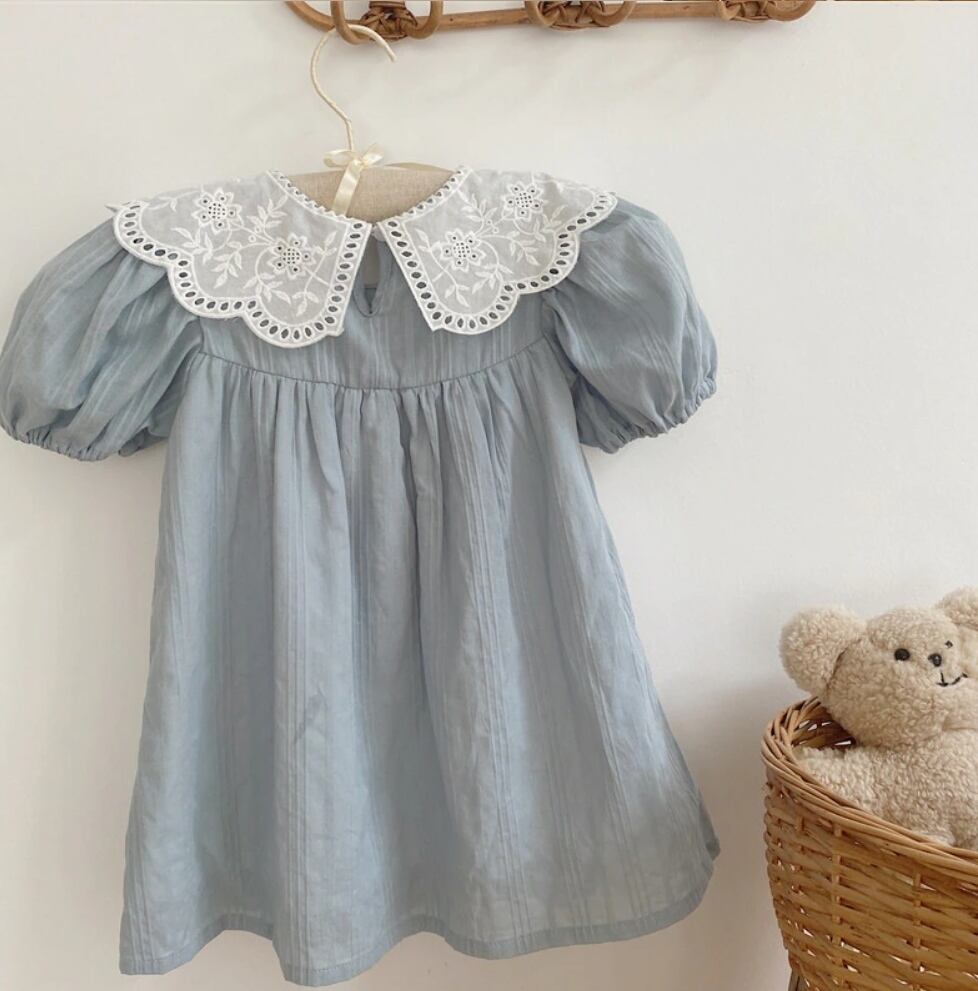 甘くて可愛らしい印象が魅力的な、レース襟のぽわん袖ブルーワンピース