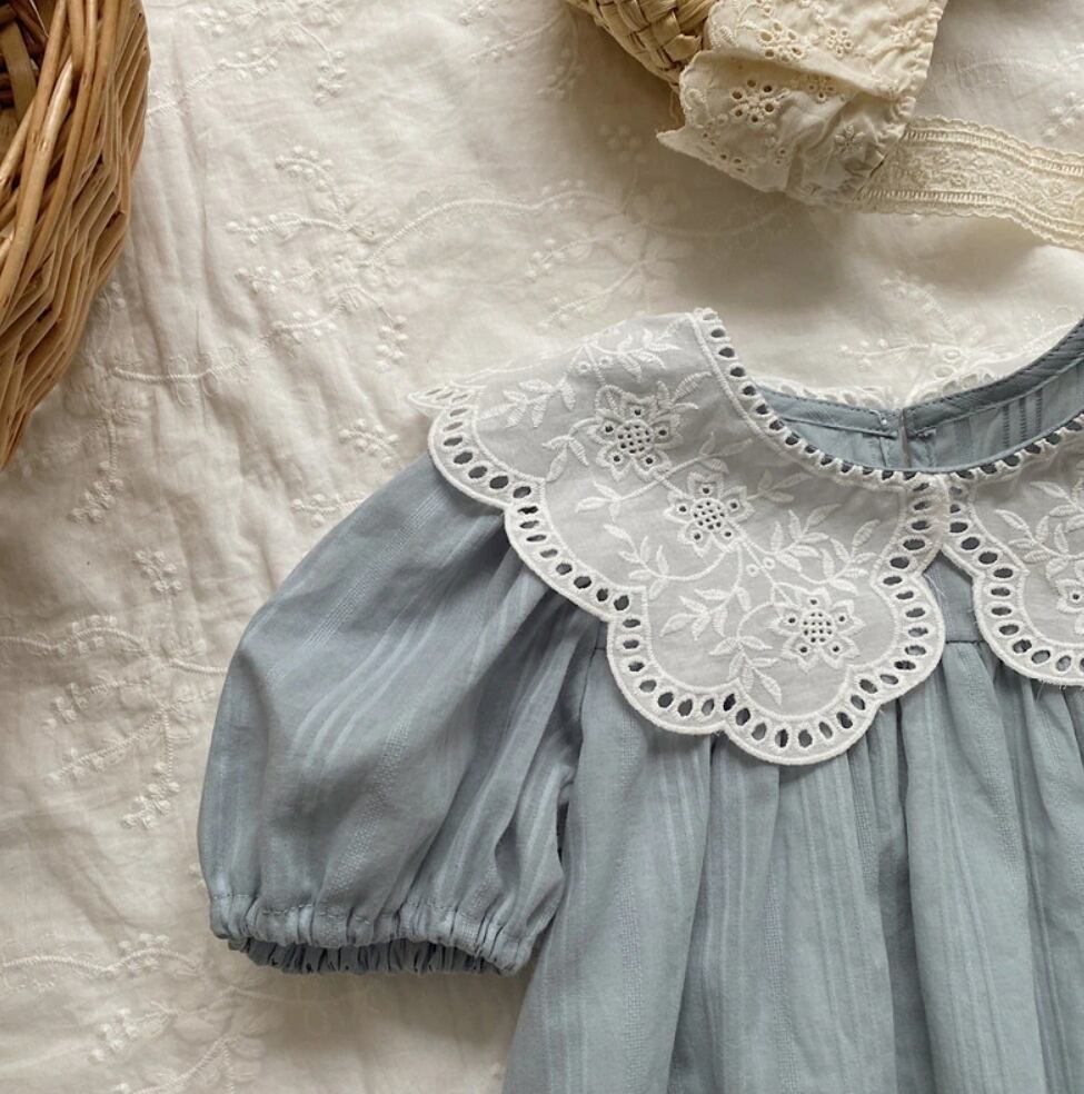 【予約】【80-130】 レース ぽわん袖 ブルーワンピース