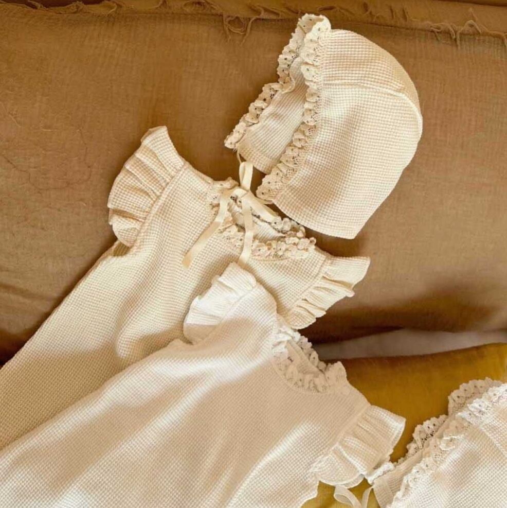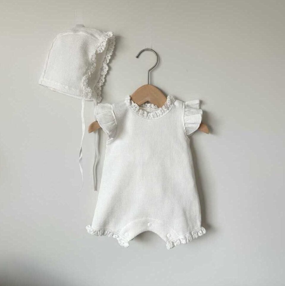 フリルが可愛い ワッフル 素材 ボンネット & ロンパース です♡