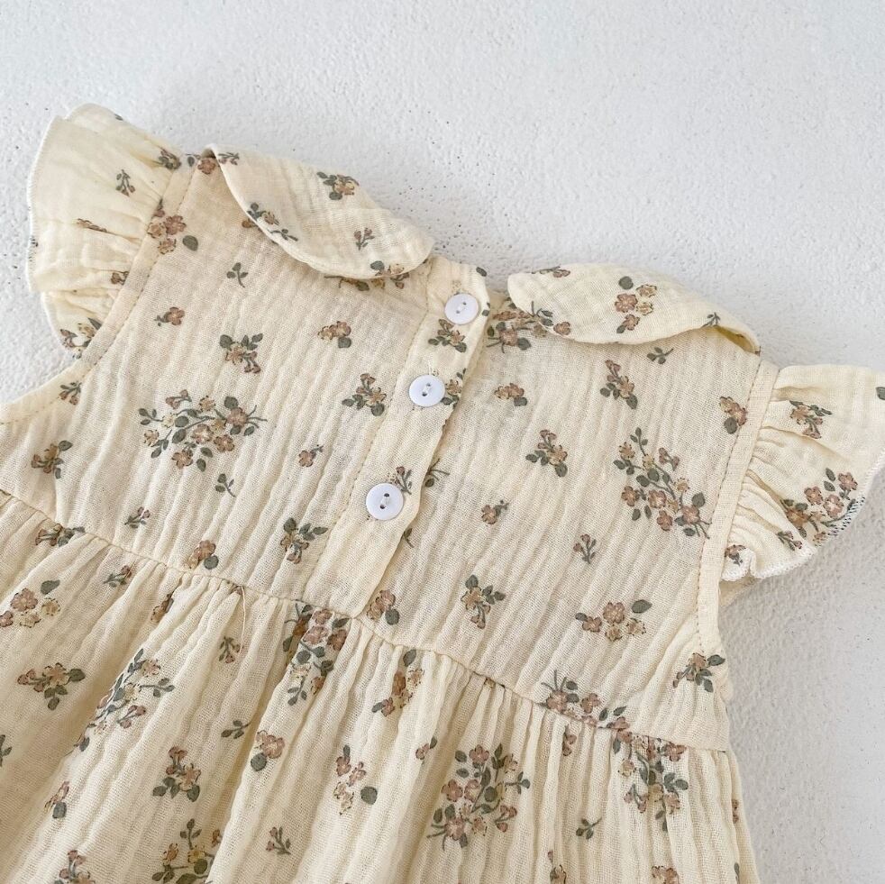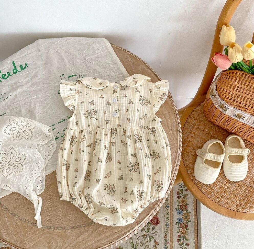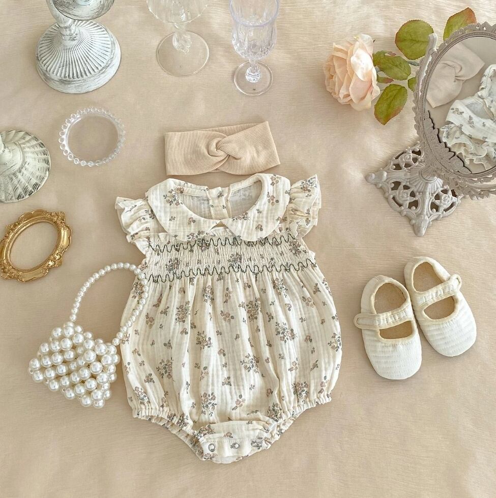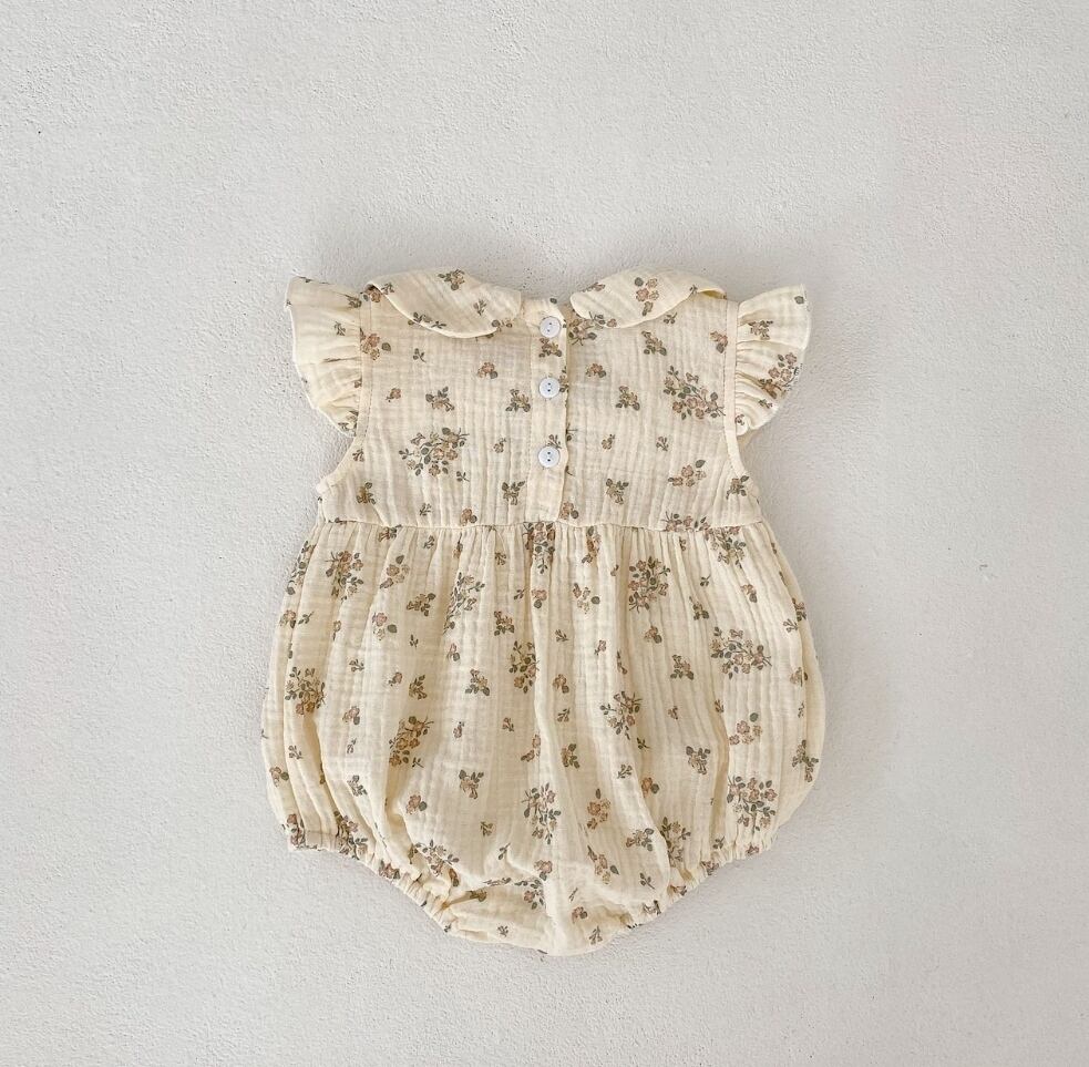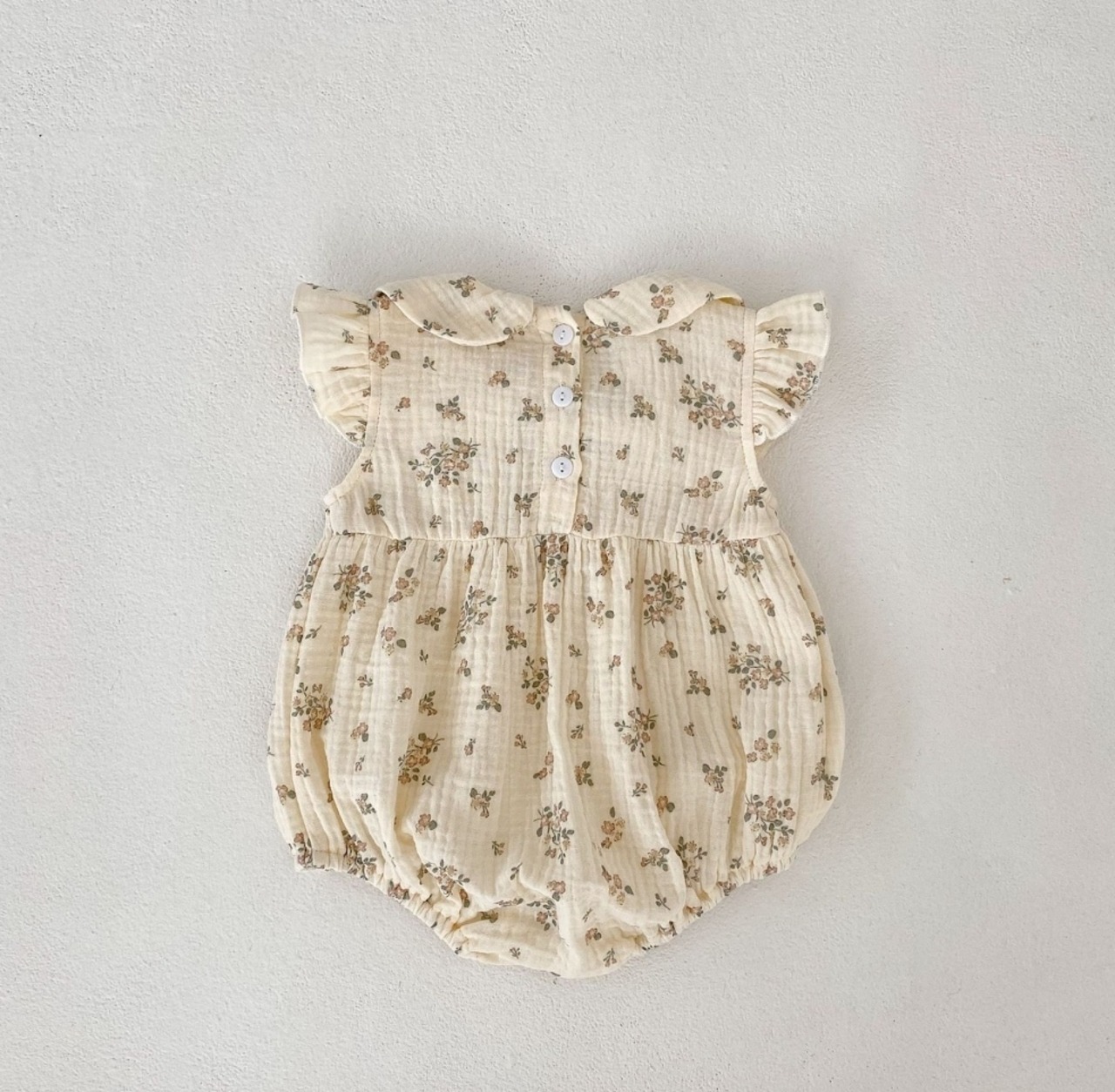 アンティークフラワー柄が可愛らしい丸襟ロンパース♡