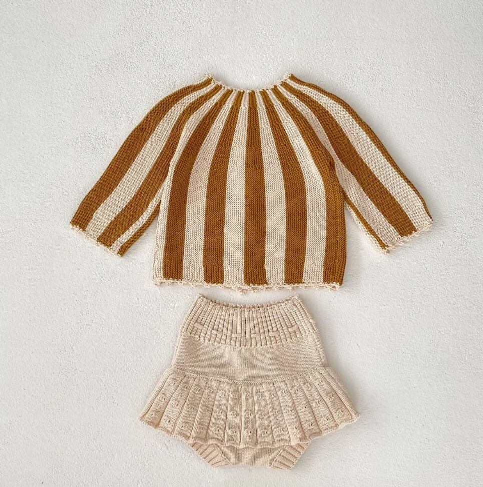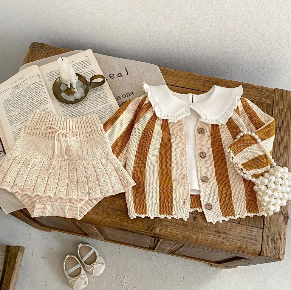 カーディガンは、ストライプ柄がオシャレな印象を与え、コーディネートのアクセントに♡