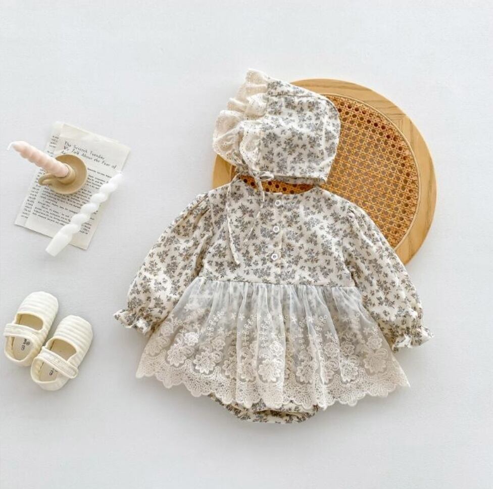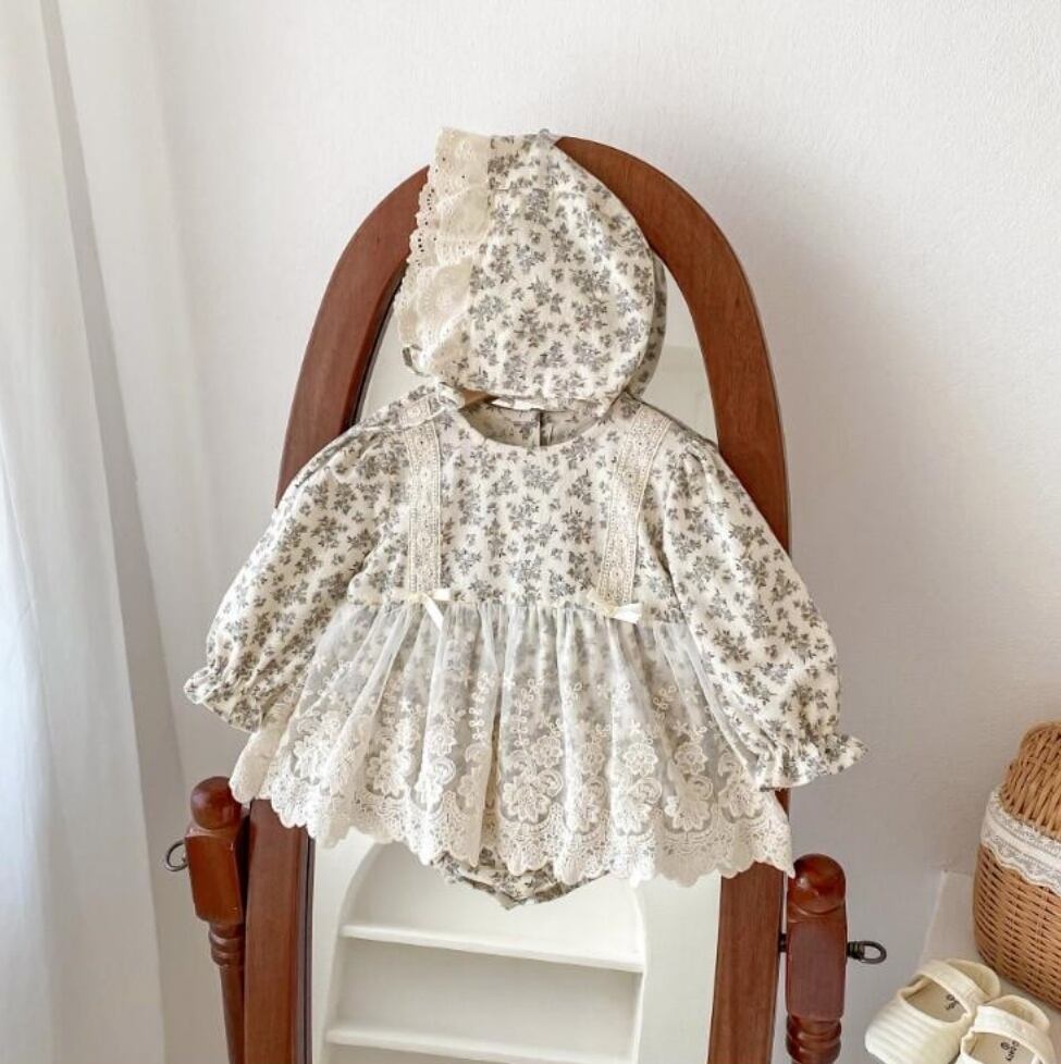 【予約】【66-90】 naturaflower cotton lace rompers & bonnet
