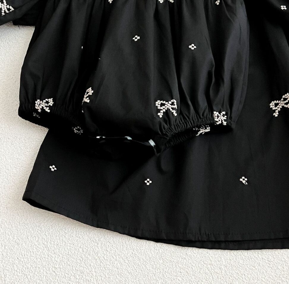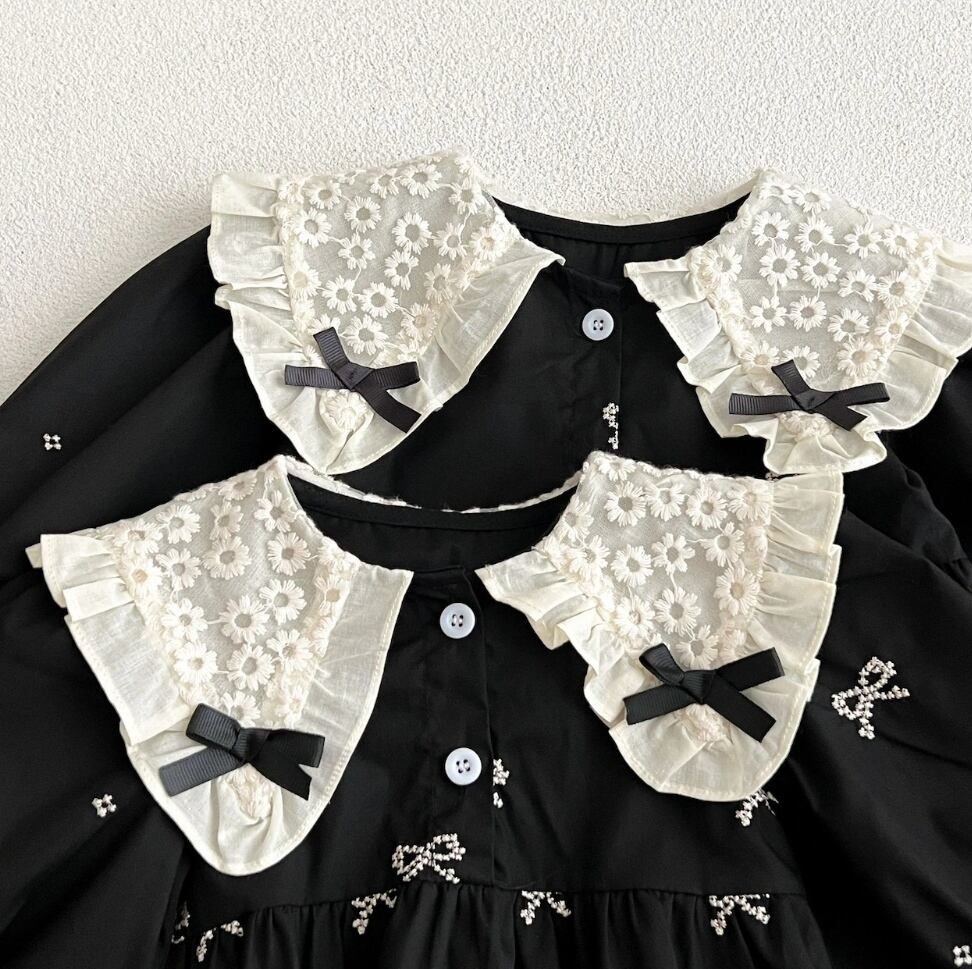 上品なビッグレース襟とribbonの刺繍がいっぱいで可愛らしいロンパースです。