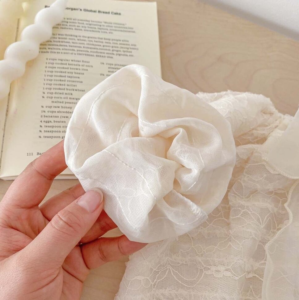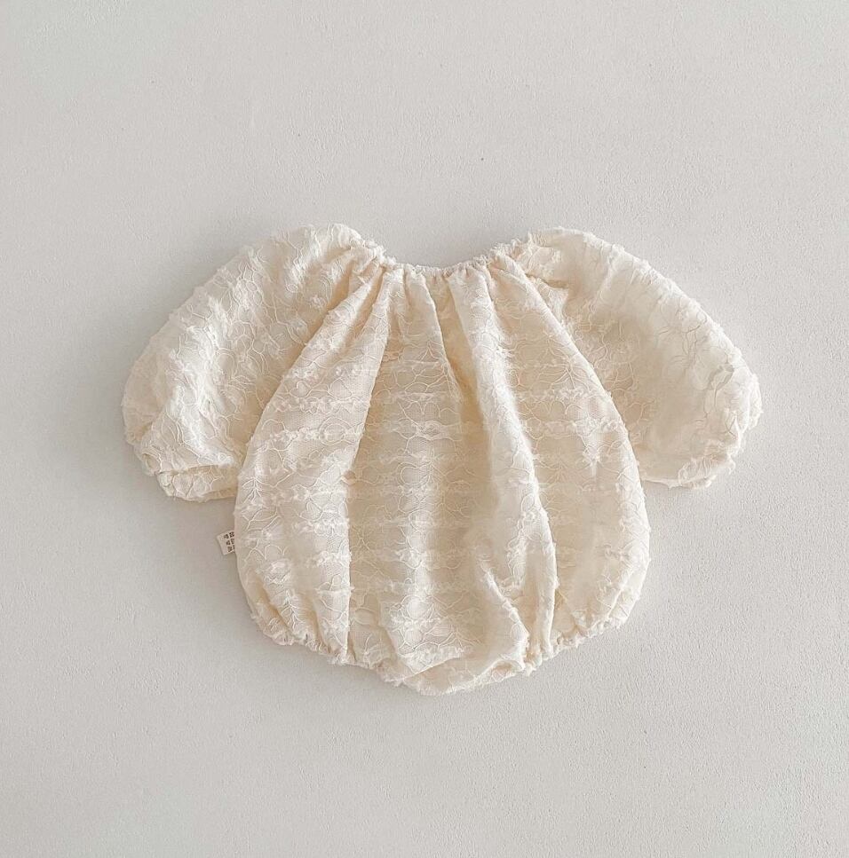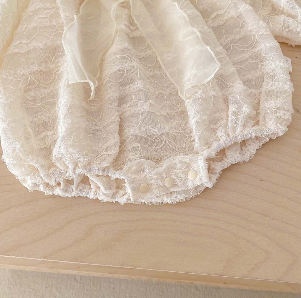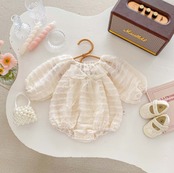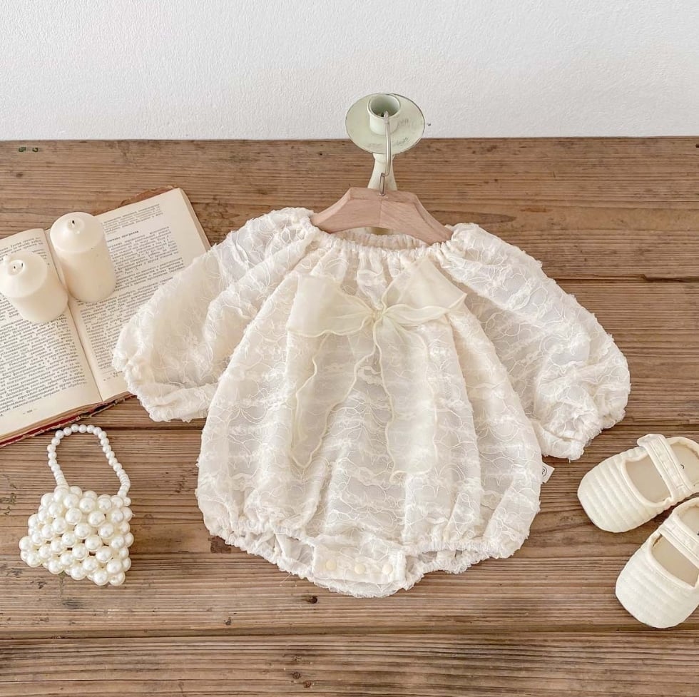 ふんわりとしたシフォン素材で作られたリボン付きのロンパースで、女の子らしさを引き立てる一着♡