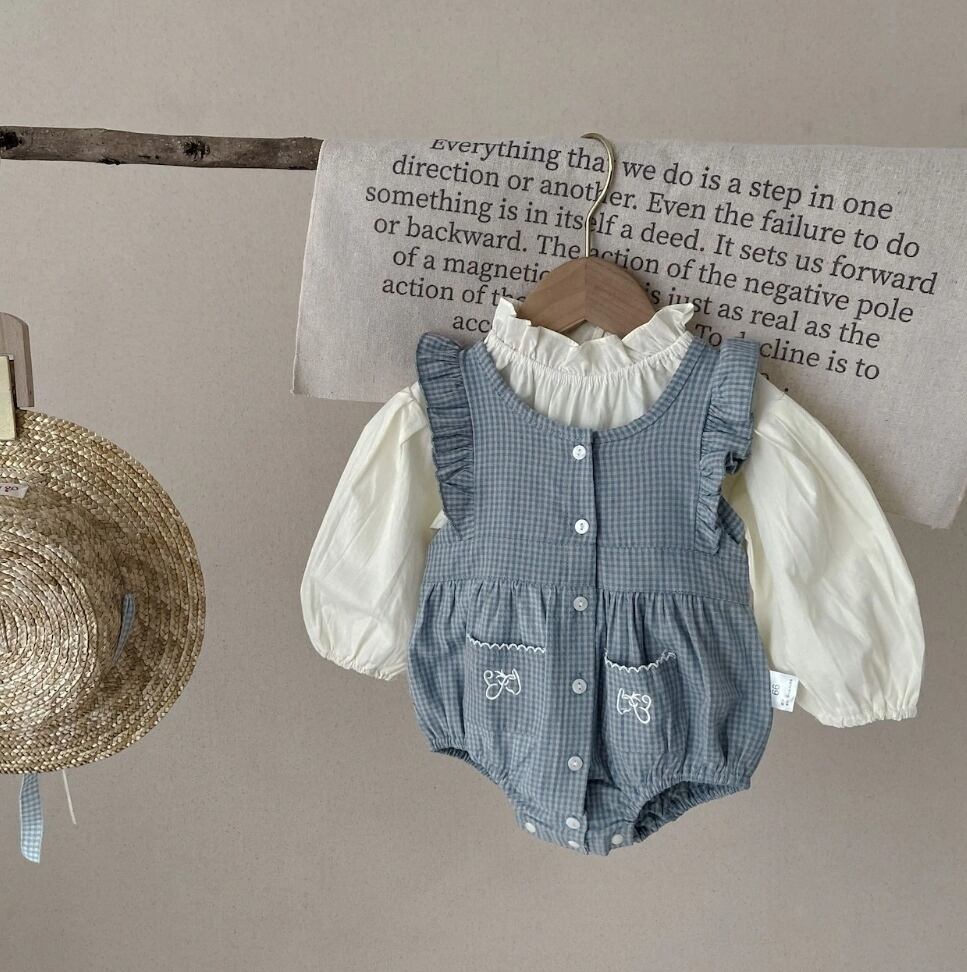 どんなシーンでも華やかな印象を与えるブルーのギンガムチェックロンパース。