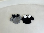 首元と大きな襟付きのふんわりロンパース。