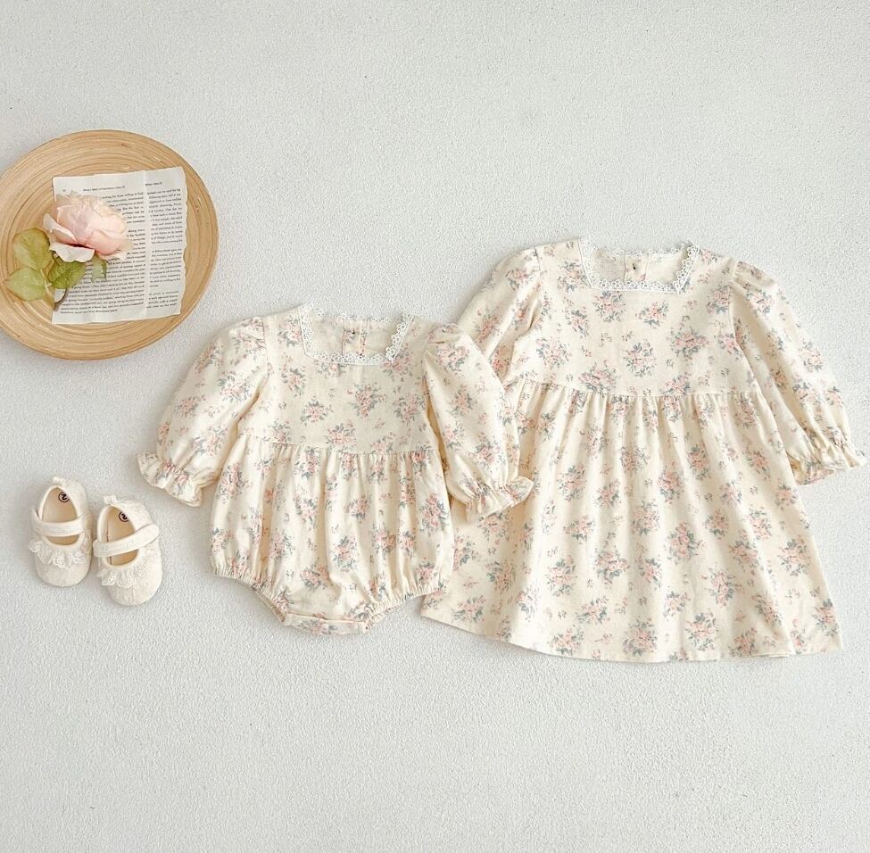 襟小花花びら袖スカート ワンピース ロンパース 姉妹服