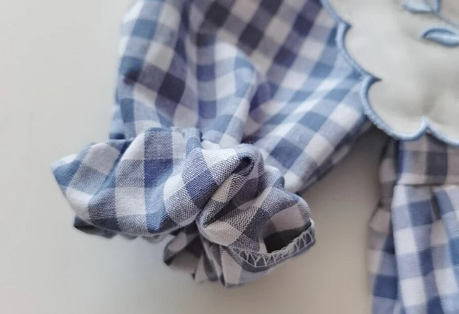 可愛らしいブルーのギンガムチェックと大きな刺繍襟が特徴的なワンピースです。
