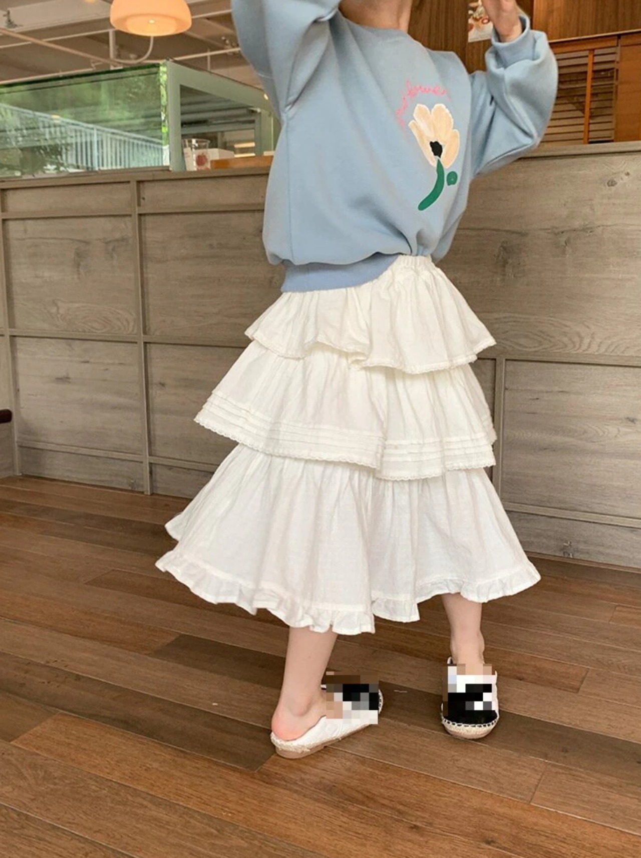 コットン素材で、程よいボリューム感が魅力のフリルロングスカート。