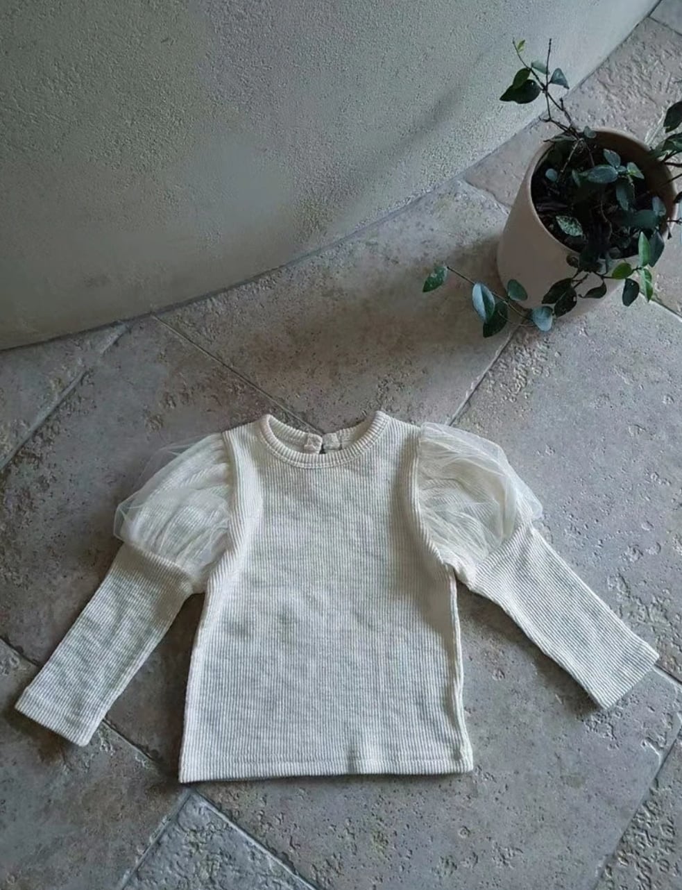 肩部分に施されたシフォン素材が、女の子らしい印象。