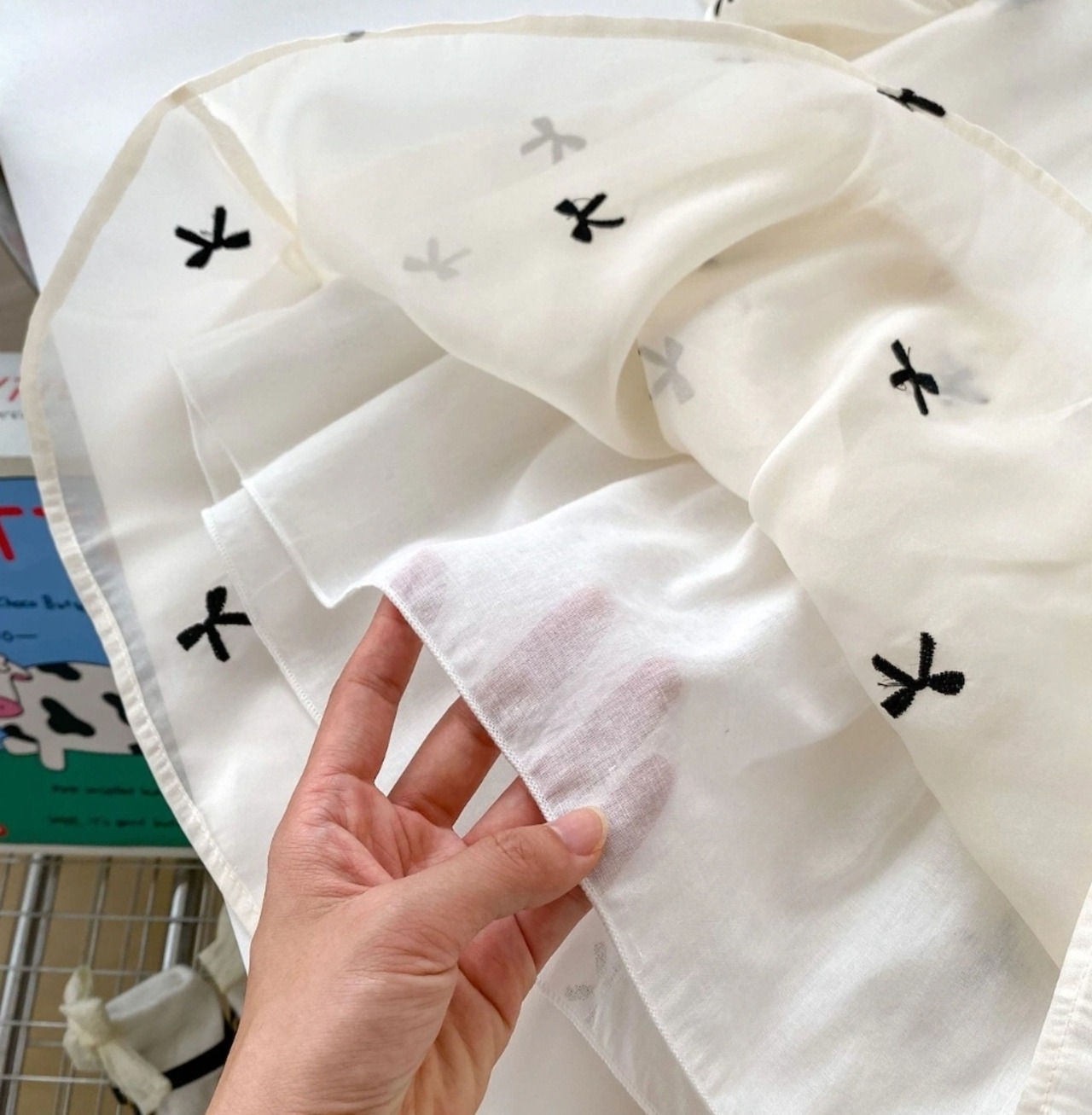 上品なシフォン可愛らしいリボン刺繍が特徴的なロンパースです。