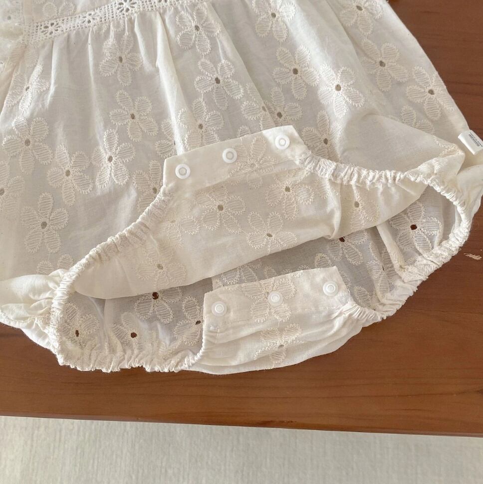 上品な可愛らしいフラワーレースが特徴的なロンパースです。