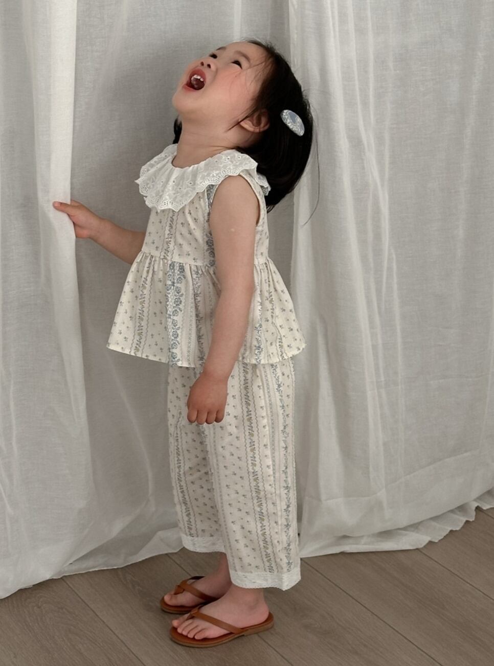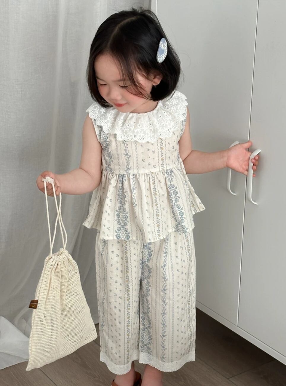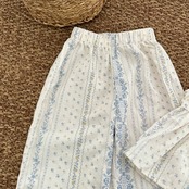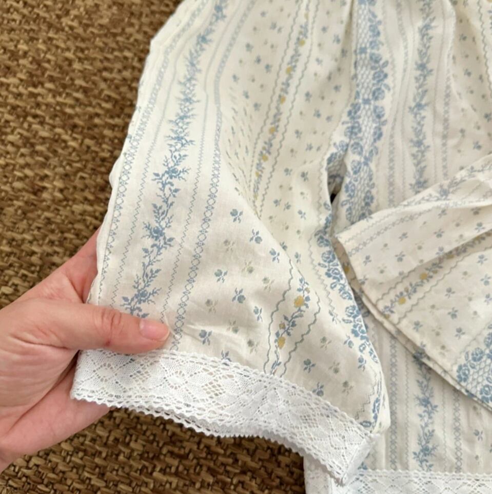 上品で可愛らしいブルーフラワーとレース襟が特徴のセットアップ♡