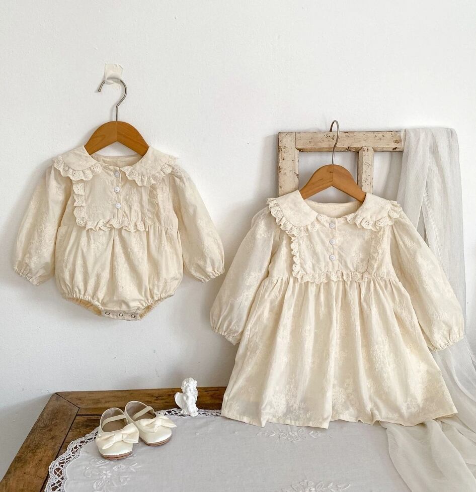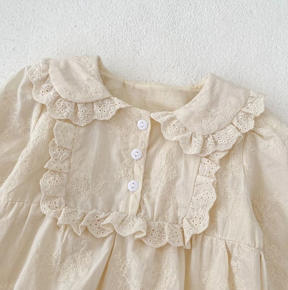 上品な刺繍が可愛らしいアンティーク風レースロンパースです。