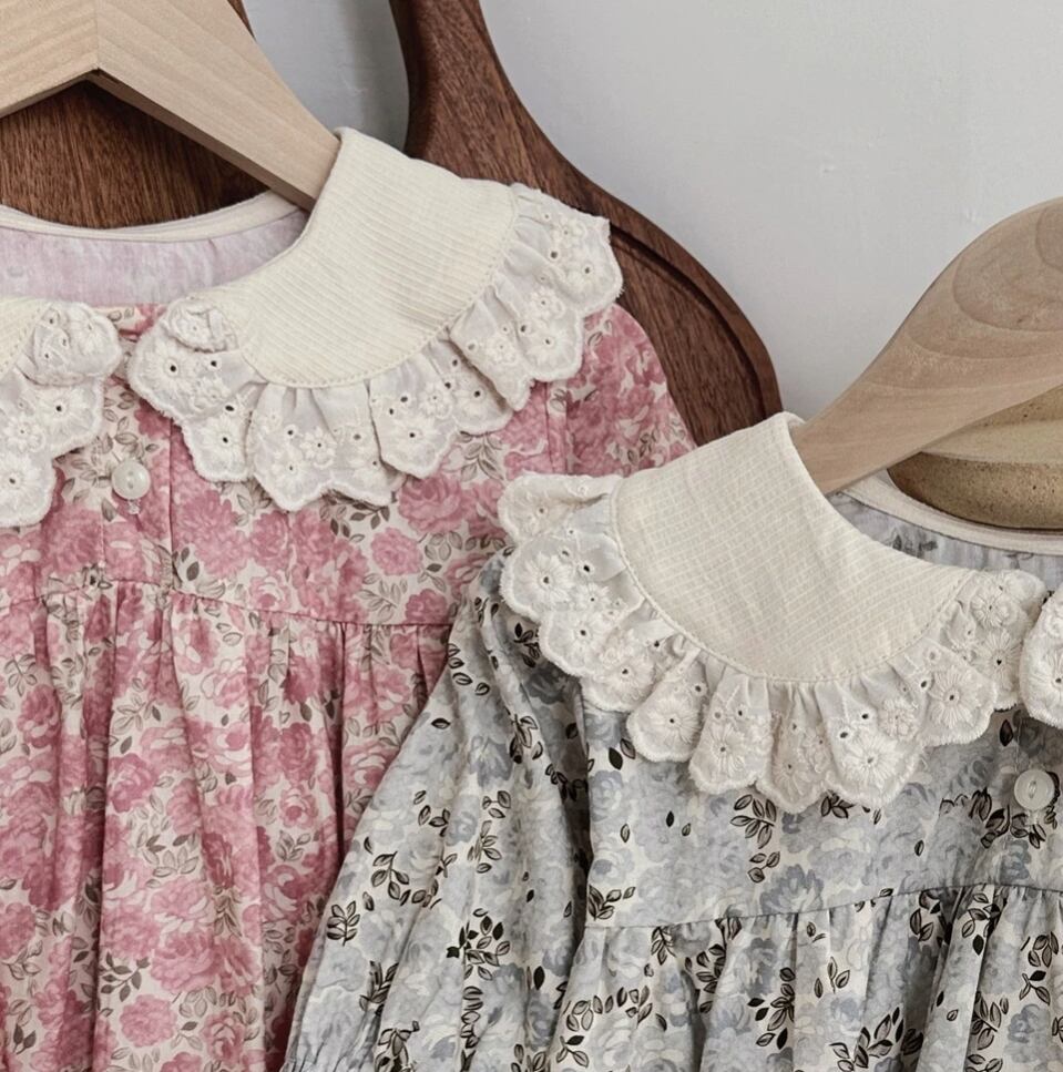 トレンド感満載の花柄刺繍が施されたロンパースとレースが可愛いコットンエプロンのセットアップ♡